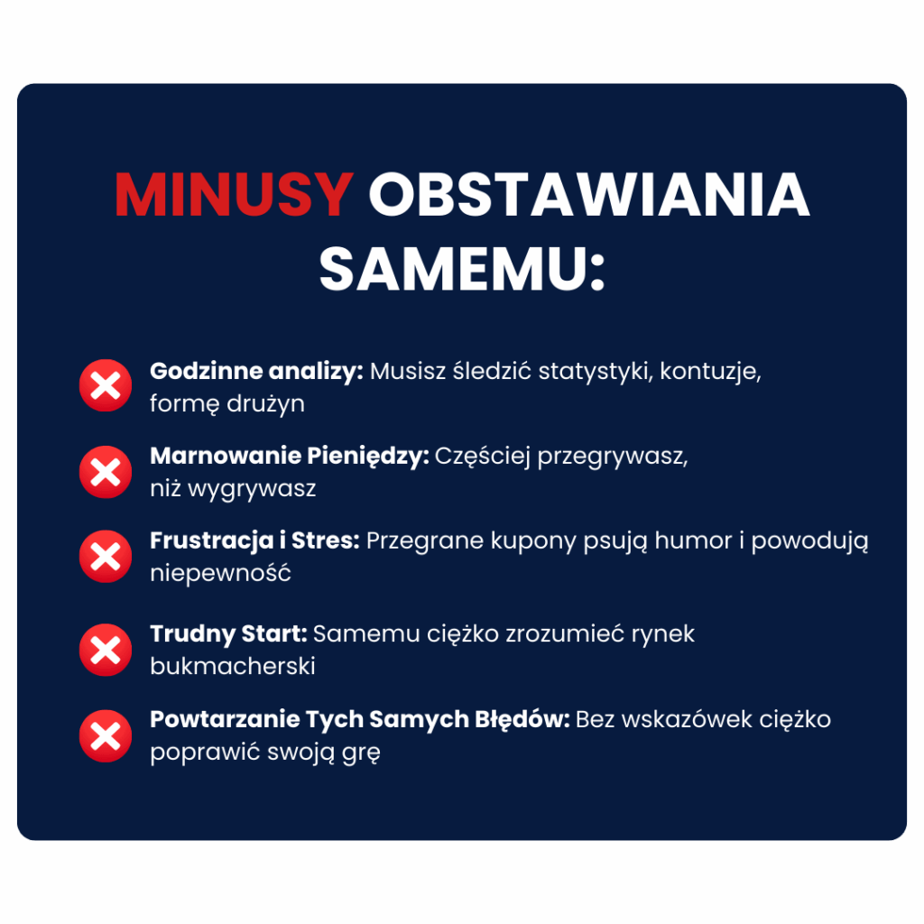 WAŻNA INFORMACJA – Prezentowane na tej stronie wyniki i statystyki mają charakter wyłącznie informacyjny i odnoszą się do naszych indywidualnych doświadczeń. Nie należy ich traktować jako gwarancji uzyskania podobnych rezultatów. Twoje wyniki mogą się różnić w zależności od wielu czynników, w tym: Twojego doświadczenia, wiedzy, zaangażowania, dyscypliny oraz zarządzania ryzykiem. Zakłady bukmacherskie wiążą się z wysokim ryzykiem utraty środków i nie są odpowiednie dla każdego. Przed podjęciem jakiejkolwiek decyzji zalecamy dokładne rozważenie swojej sytuacji finansowej i skonsultowanie się z niezależnym doradcą. Nie jesteśmy bukmacherem, nie przyjmujemy wpłat ani nie zarządzamy środkami użytkowników. Działamy wyłącznie w charakterze edukacyjnym i afiliacyjnym. Jeśli nie jesteś gotów zaakceptować ryzyka oraz faktu, że sukces wymaga pracy, wiedzy i konsekwencji, prosimy – nie korzystaj z naszych usług ani materiałów.